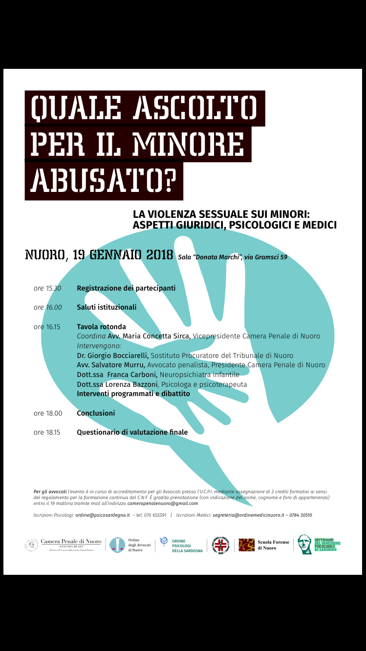 Interverrano in qualità di relatori l’avv. Salvatore Murru, avvocato penalista e presidente della Camera penale locale, La dott.ssa Lorenza Bazzoni, psicologa e psicoterapeuta, il dott. Giorgio Bocciarelli, sostituto procure presso il Tribunale di Nuoro, la Dott.ssa Franca Carboni, Neuro psichiatra infantile.